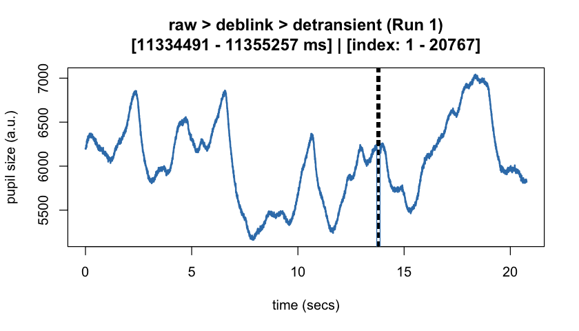| Transient (Speed-Based) Artifact Removal | detransient() | Remove transient spikes in the pupil signal using a moving MAD filter. |